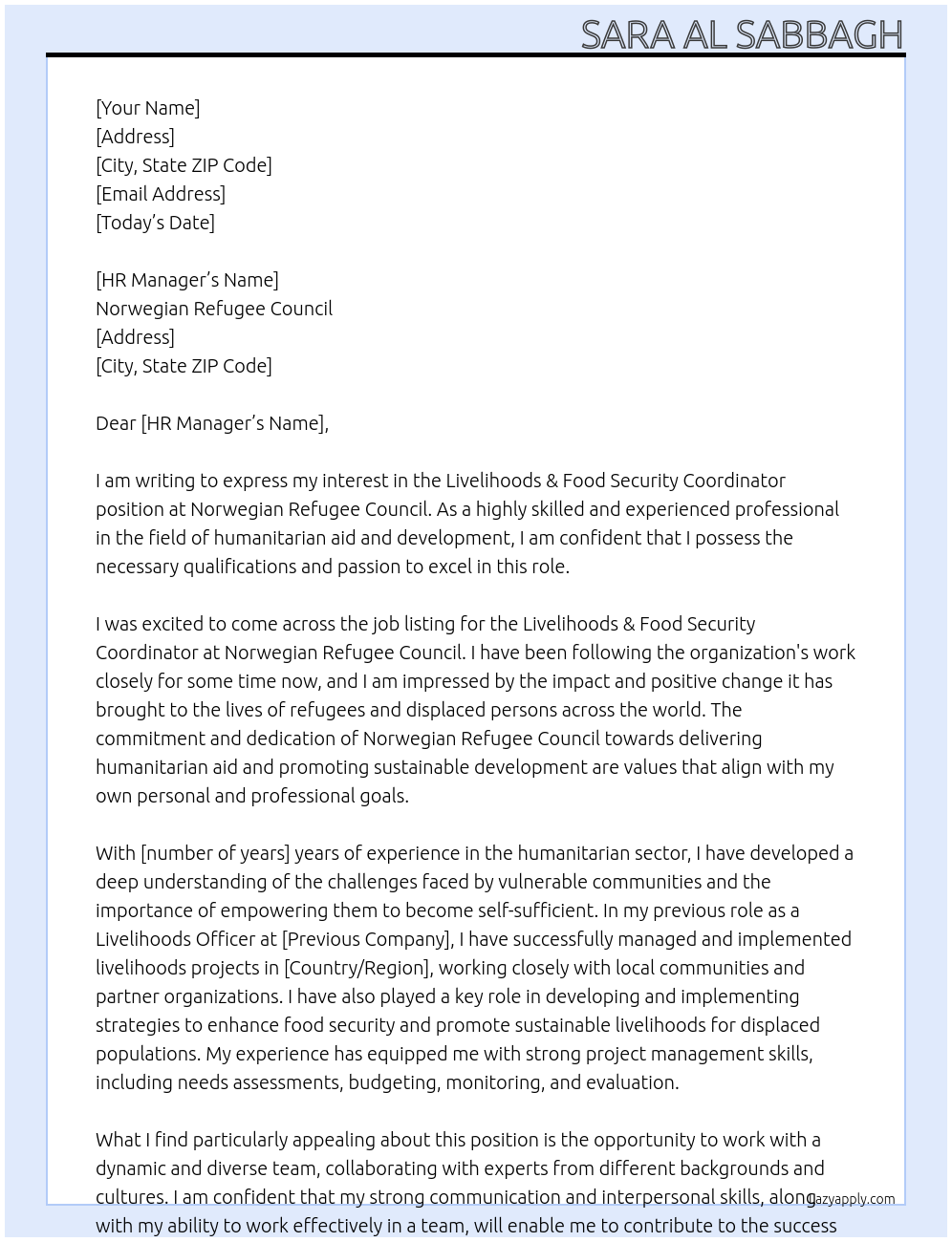 Livelihoods & Food Security Coordinator Cover Letter At Norwegian Refugee Council