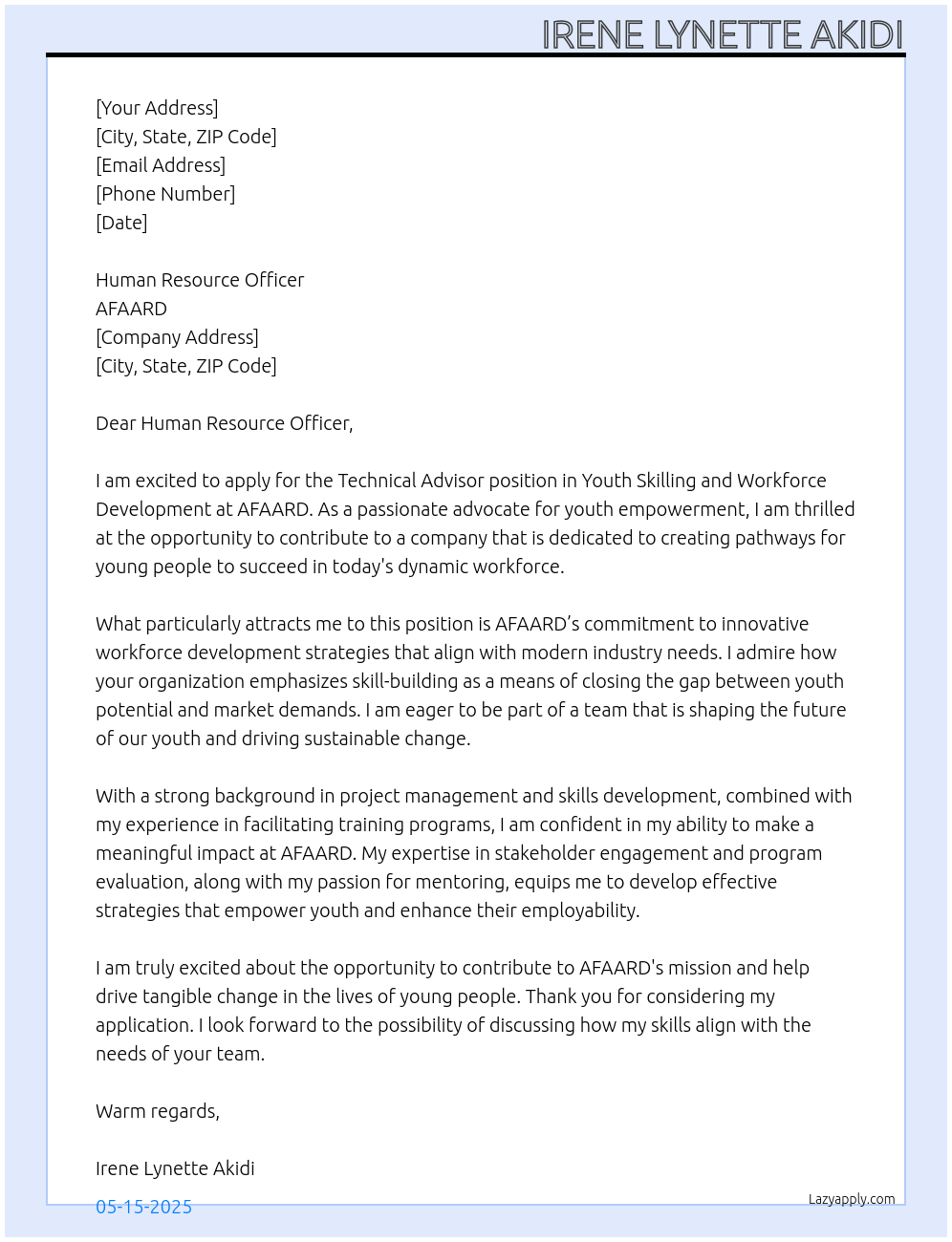 Technical Advisor, Youth Skiilling and Workforce Development Cover Letter At AFAARD