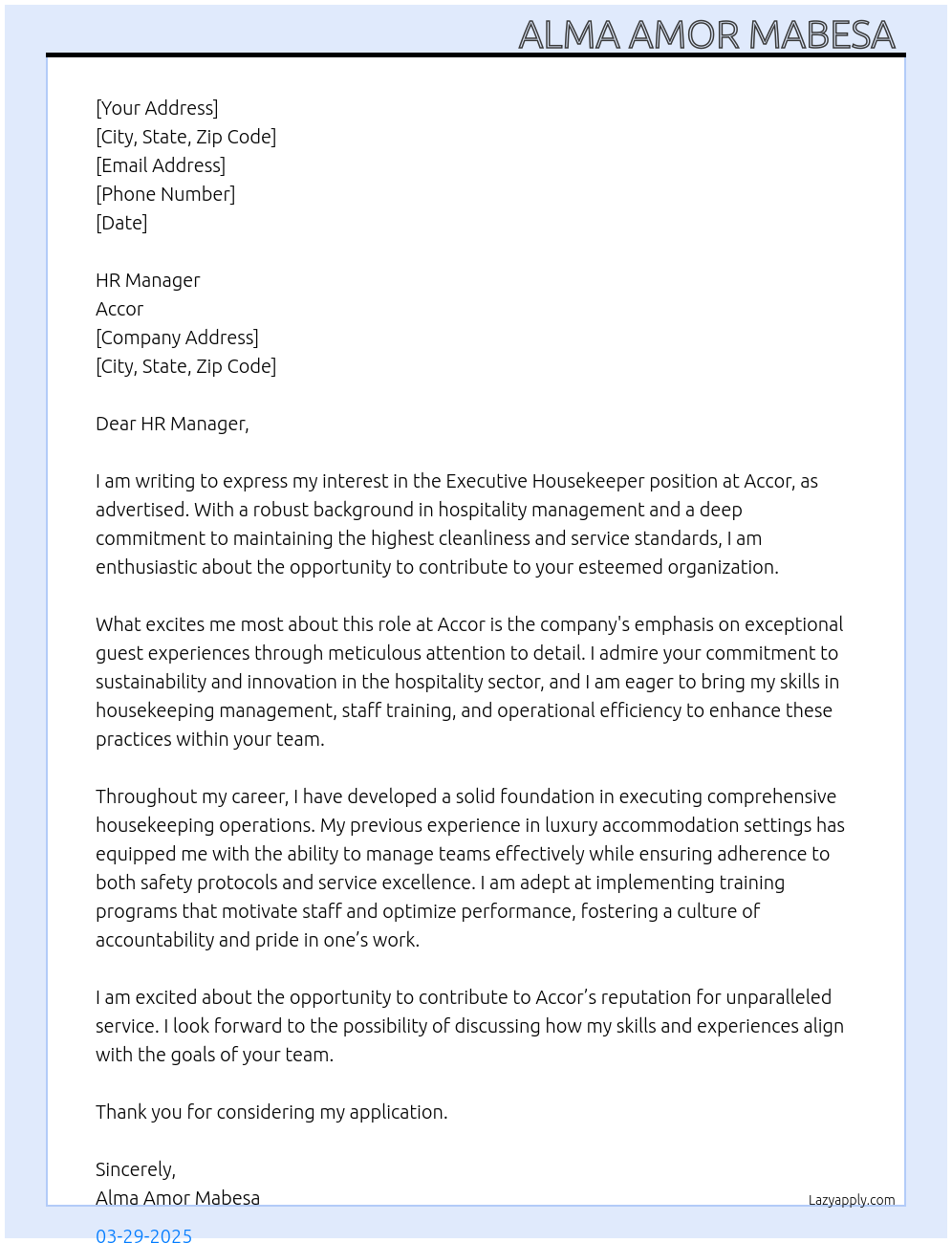 Check out these executive housekeeper cover letter sample and examples previously used by job seekers to land on job interviews as executive housekeeper. Use our AI cover letter generator to create a personalized cover letter as executive housekeeper.