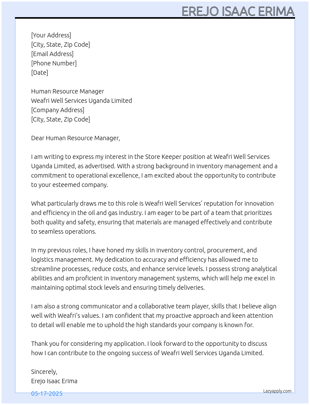 Store Keeper - Weafri Well Services Uganda Limited Cover Letter Examples And Template