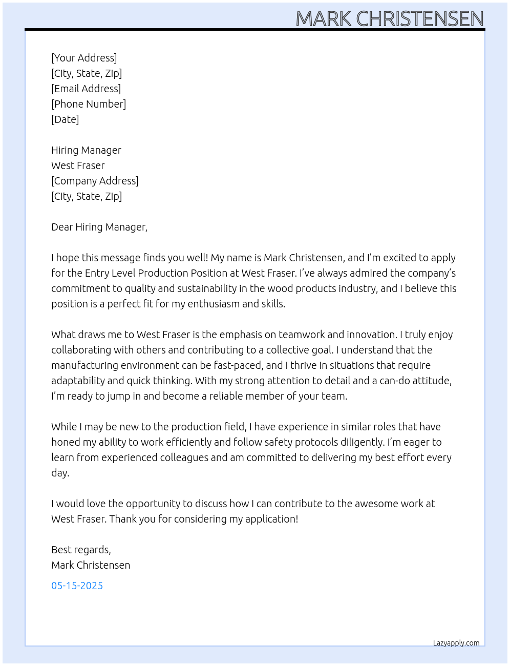 Check out these entry level production position cover letter sample and examples previously used by job seekers to land on job interviews as entry level production position. Use our AI cover letter generator to create a personalized cover letter as entry level production position.