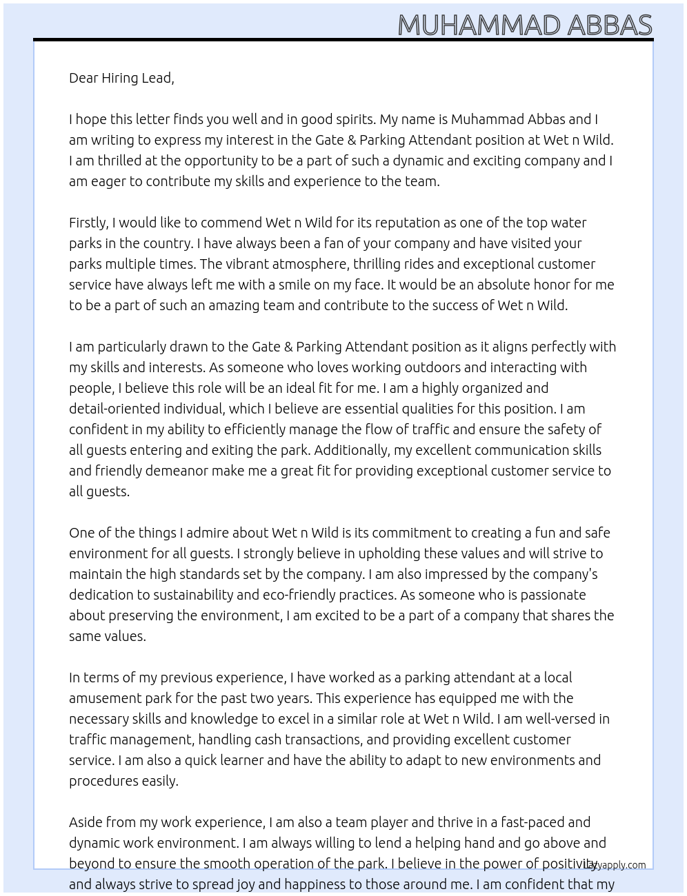 Gate & Parking attendant Cover Letter At Wet n Wild