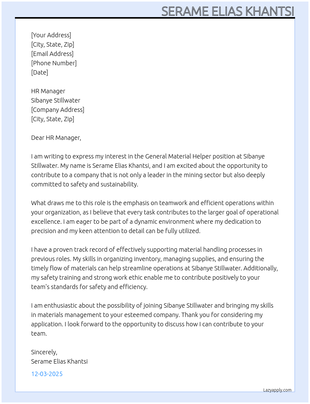 General Material Helper Cover Letter At Sibanye Stillwater