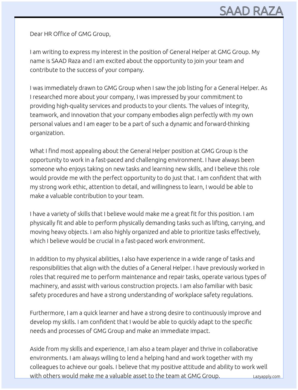 Cover letter for genral helper - LazyApply