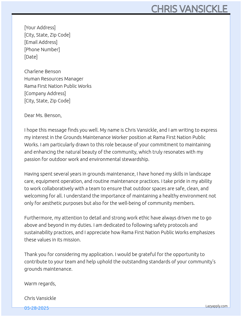 Check out these grounds maintenance worker cover letter sample and examples previously used by job seekers to land on job interviews as grounds maintenance worker. Use our AI cover letter generator to create a personalized cover letter as grounds maintenance worker.