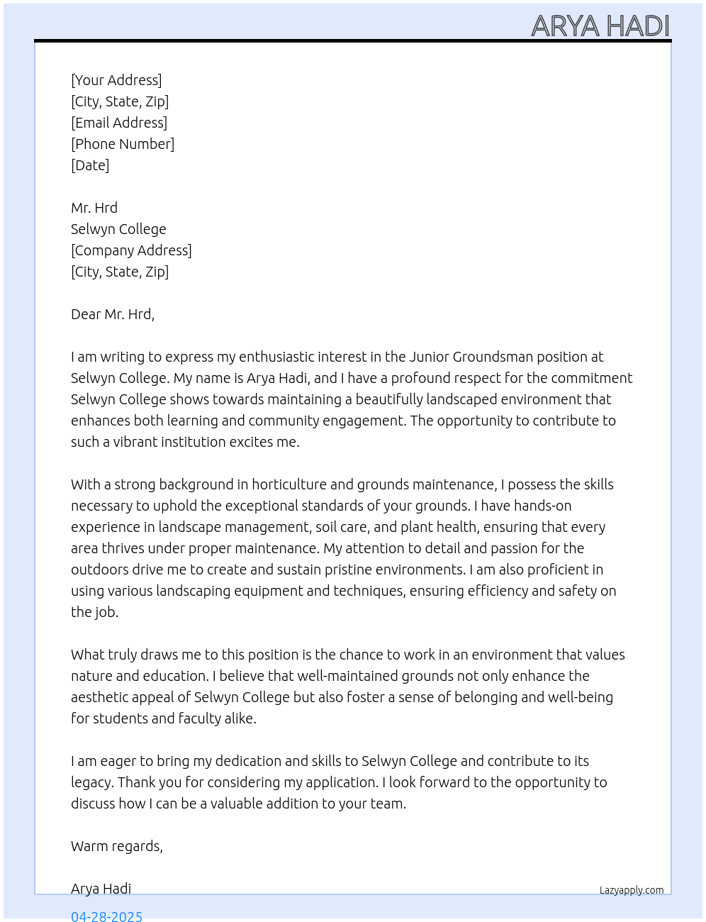 Check out these junior groundsman cover letter sample and examples previously used by job seekers to land on job interviews as junior groundsman. Use our AI cover letter generator to create a personalized cover letter as junior groundsman.