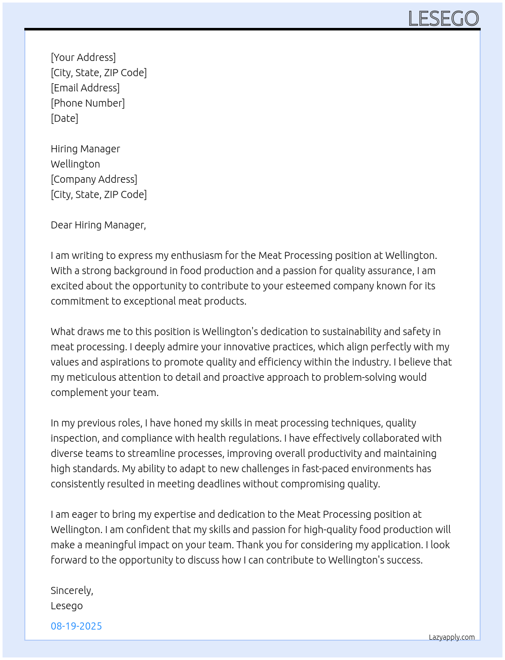 Meat processing Cover Letter At Wellington