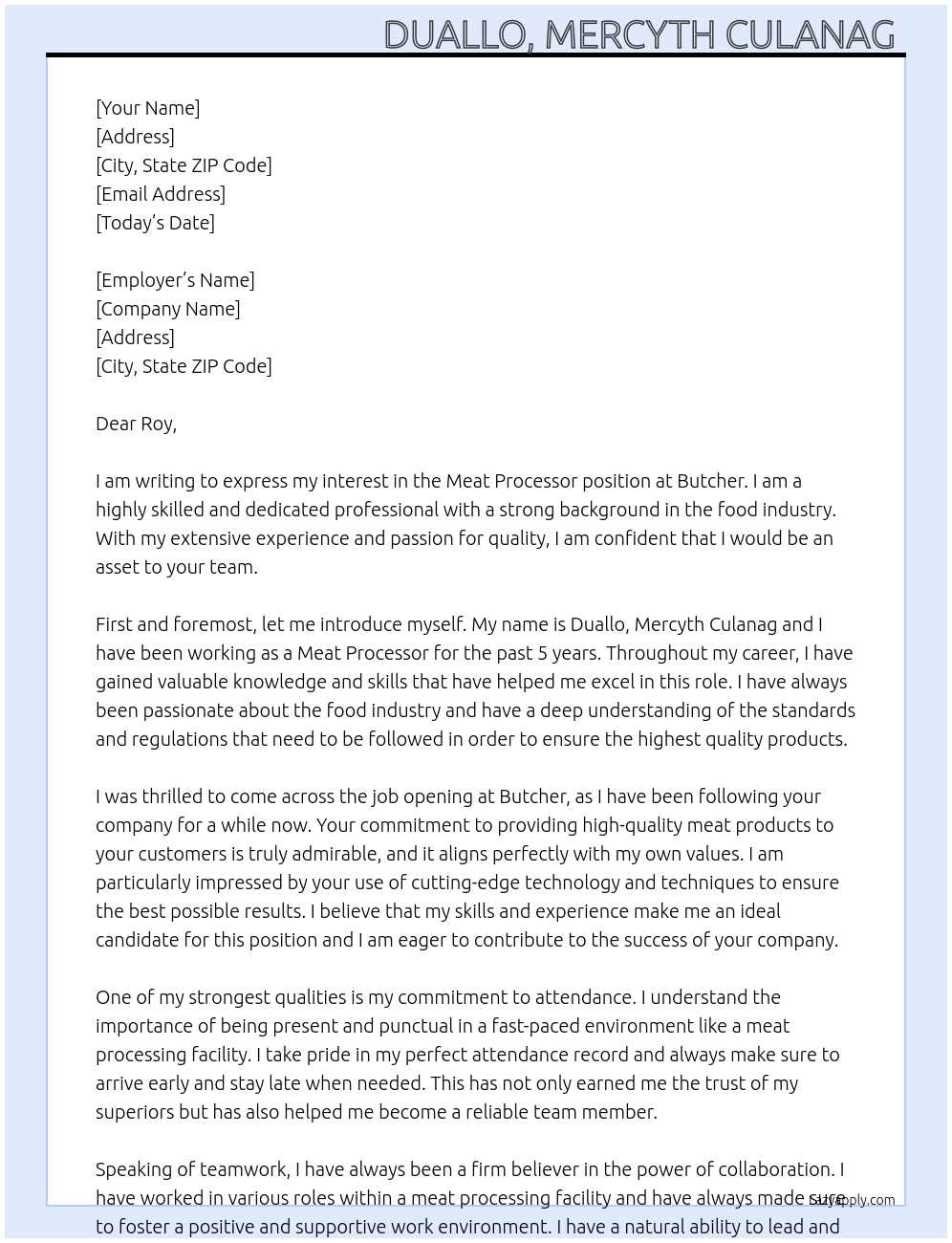 Check out these meat processor cover letter sample and examples previously used by job seekers to land on job interviews as meat processor. Use our AI cover letter generator to create a personalized cover letter as meat processor.