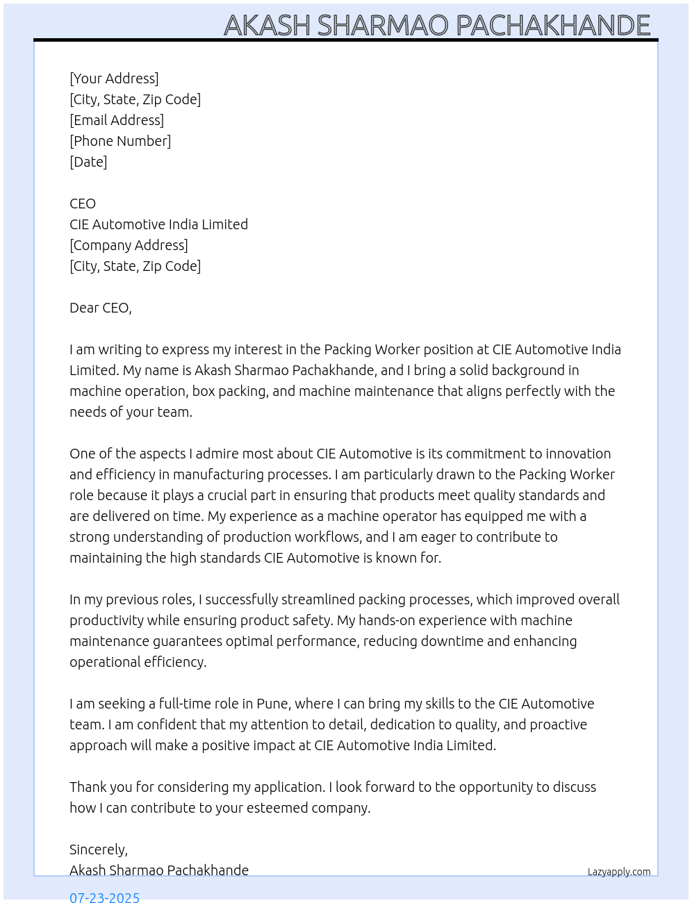 Packing workar Cover Letter At CIE automotive India limited