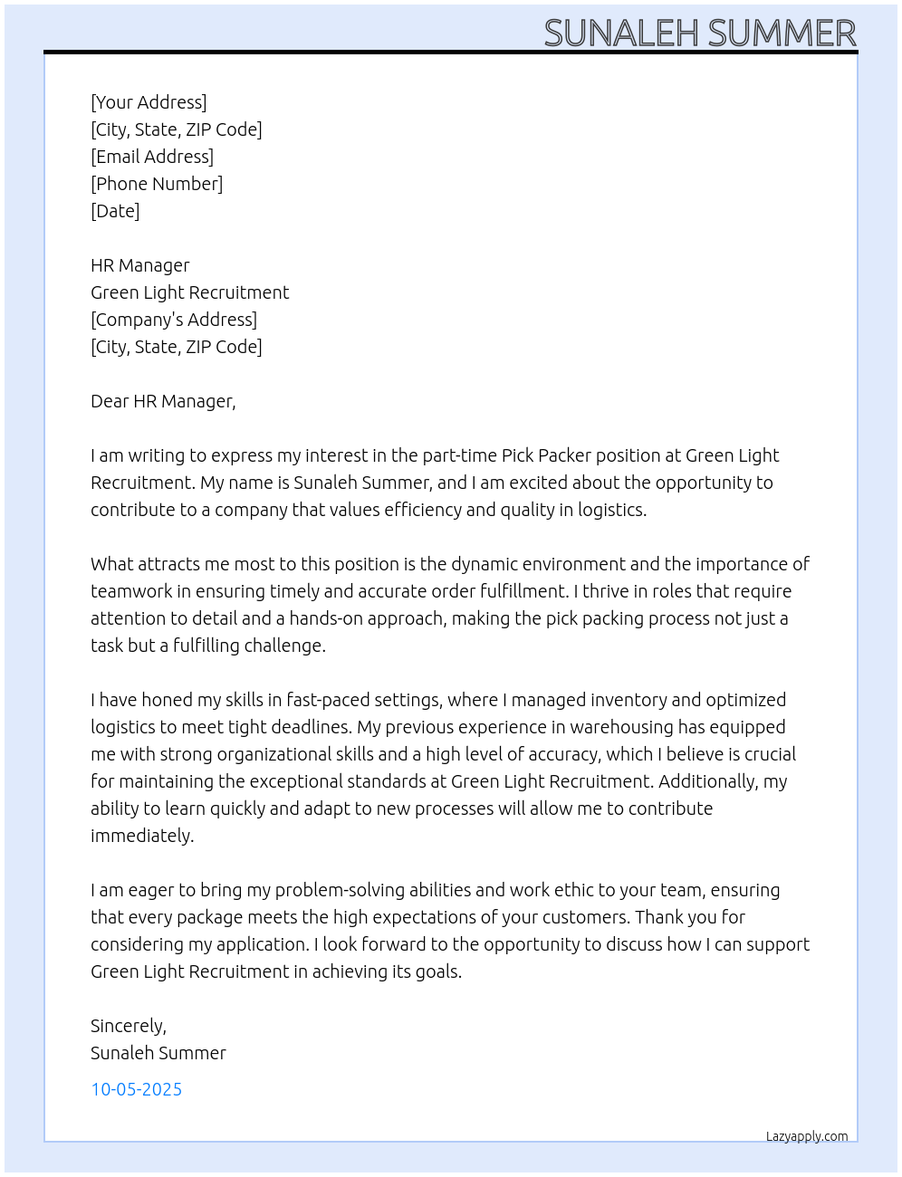 Pick Packer - Part Time Position Cover Letter Examples And Template