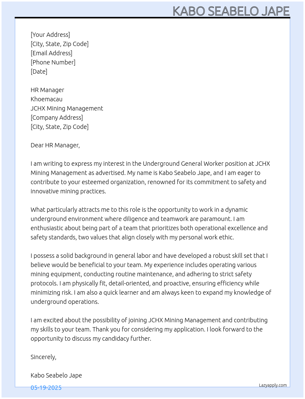 underground general worker Cover Letter At JCHX mining management