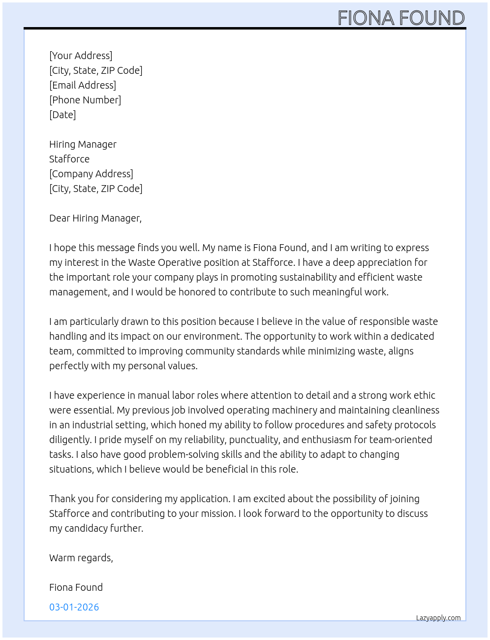 Check out these waste operative cover letter sample and examples previously used by job seekers to land on job interviews as waste operative. Use our AI cover letter generator to create a personalized cover letter as waste operative.