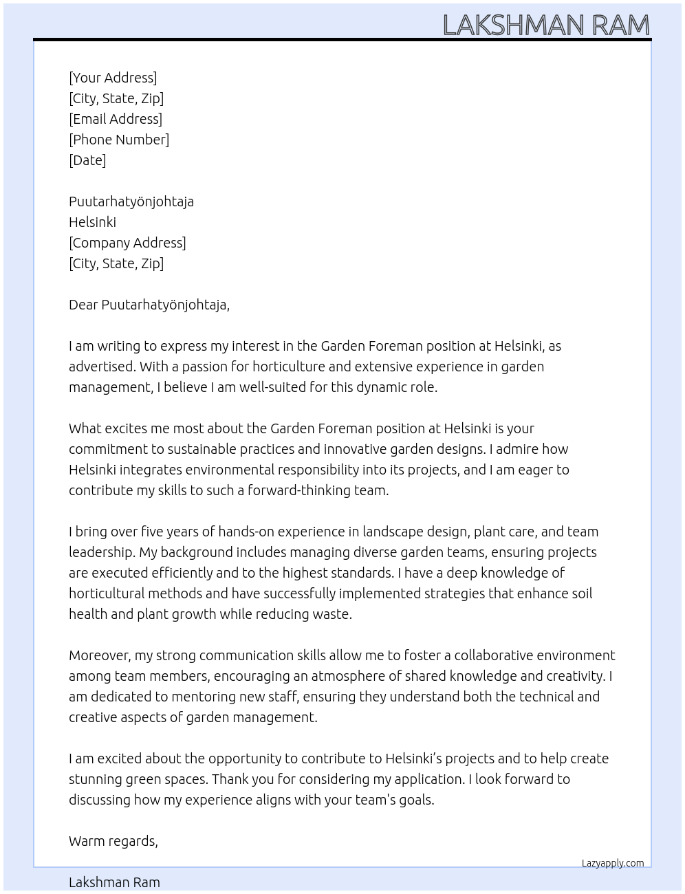 Check out these garden forman cover letter sample and examples previously used by job seekers to land on job interviews as garden forman. Use our AI cover letter generator to create a personalized cover letter as garden forman.