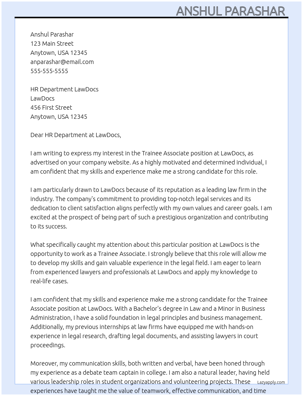 Application For Trainee Associate Position At Lawdocs Cover Letter Examples And Template