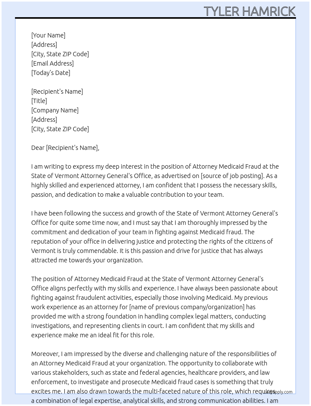 Attorney Medicaid Fraud Cover Letter At State of Vermont Attorney General's Office