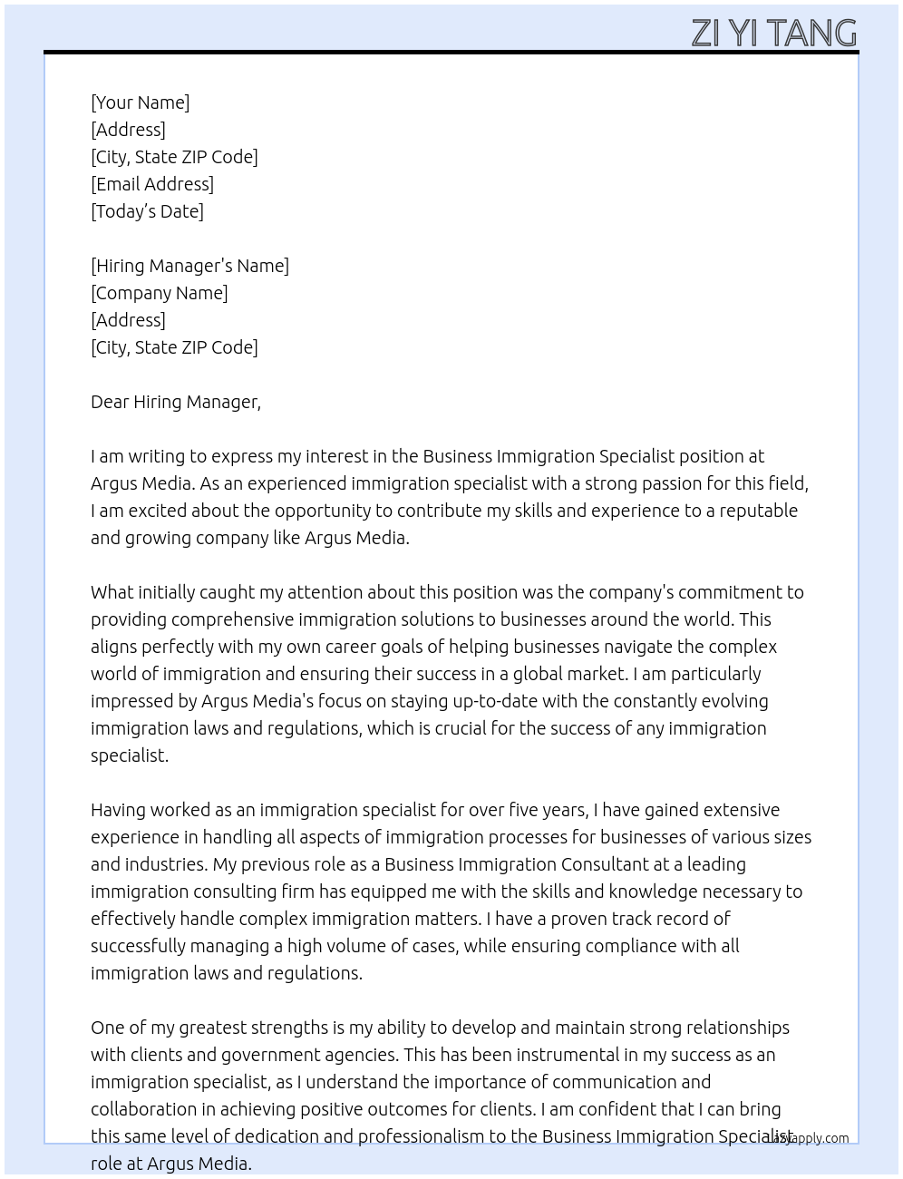 Check out these business immigration specialist cover letter sample and examples previously used by job seekers to land on job interviews as business immigration specialist. Use our AI cover letter generator to create a personalized cover letter as business immigration specialist.