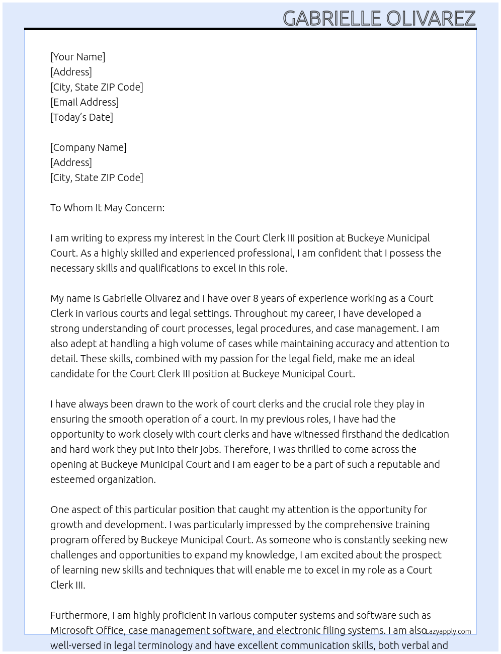 Check out these court clerk iii cover letter sample and examples previously used by job seekers to land on job interviews as court clerk iii. Use our AI cover letter generator to create a personalized cover letter as court clerk iii.