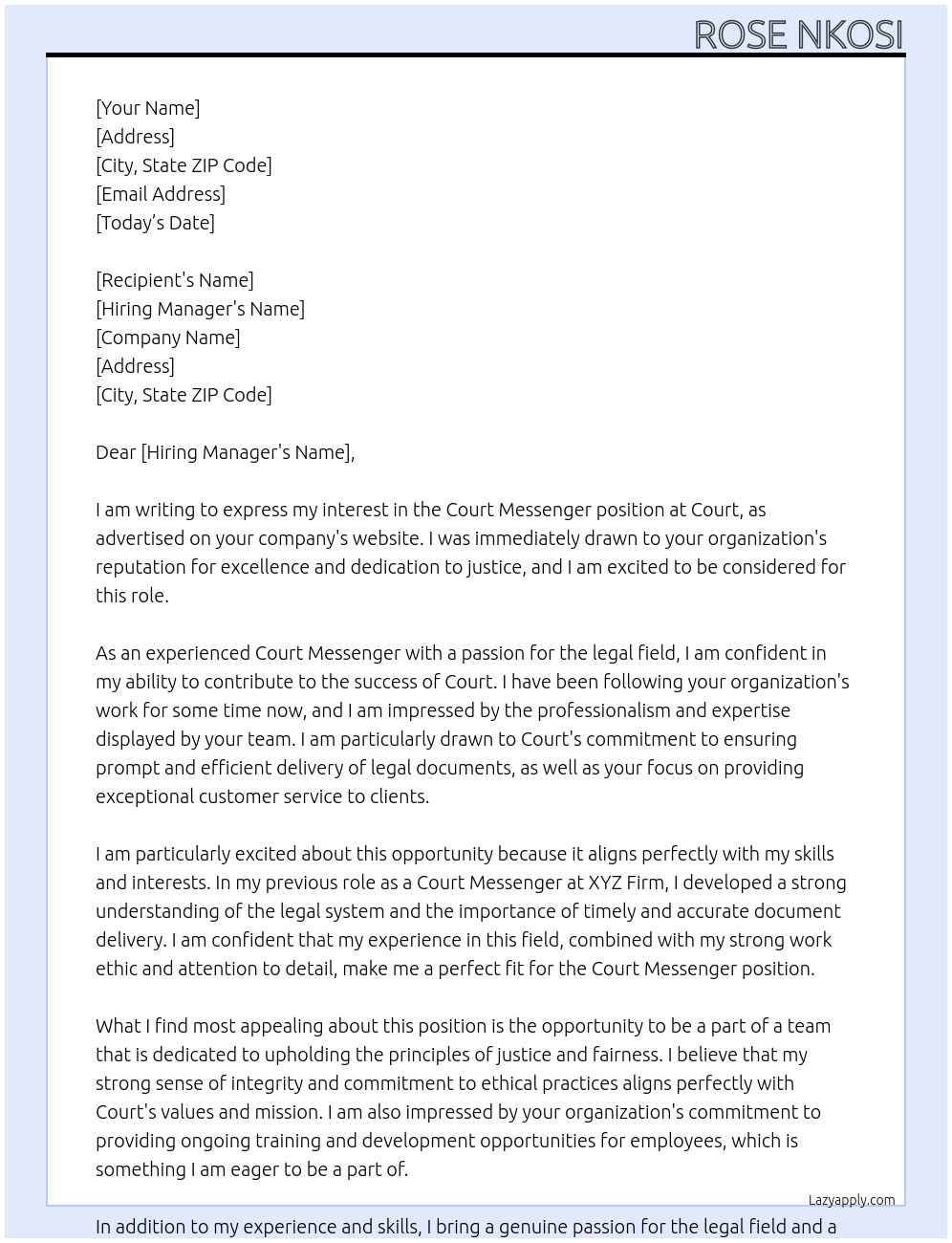 Check out these court messager cover letter sample and examples previously used by job seekers to land on job interviews as court messager. Use our AI cover letter generator to create a personalized cover letter as court messager.