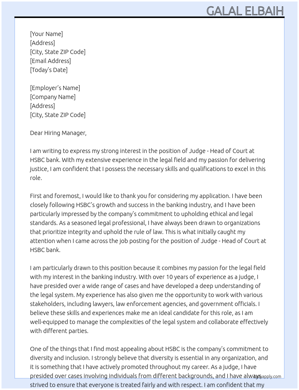 Check out these judge - head of court cover letter sample and examples previously used by job seekers to land on job interviews as judge - head of court. Use our AI cover letter generator to create a personalized cover letter as judge - head of court.