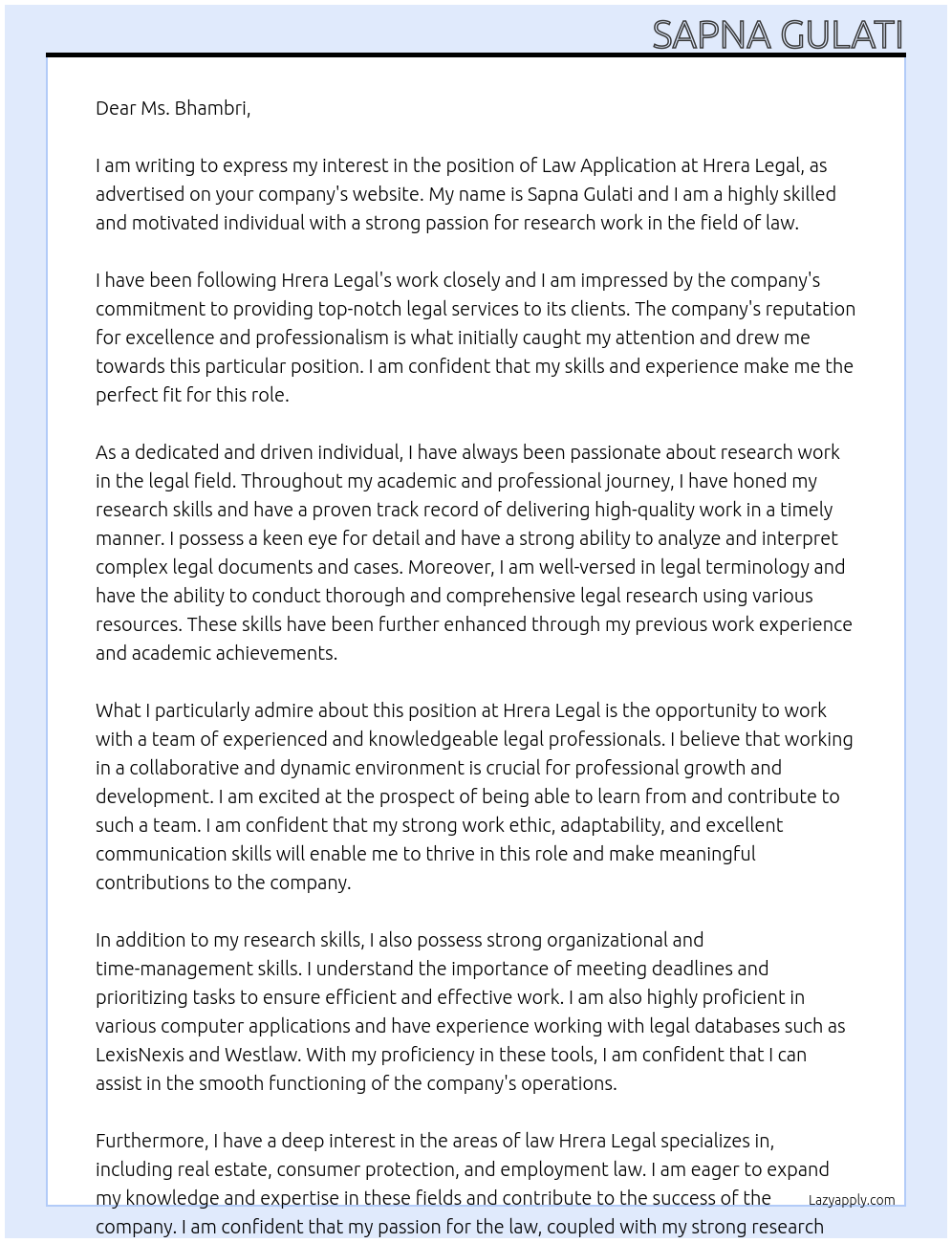 Check out these law application cover letter sample and examples previously used by job seekers to land on job interviews as law application. Use our AI cover letter generator to create a personalized cover letter as law application.