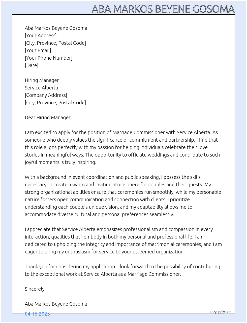 Check out these marriage commissioner cover letter sample and examples previously used by job seekers to land on job interviews as marriage commissioner. Use our AI cover letter generator to create a personalized cover letter as marriage commissioner.