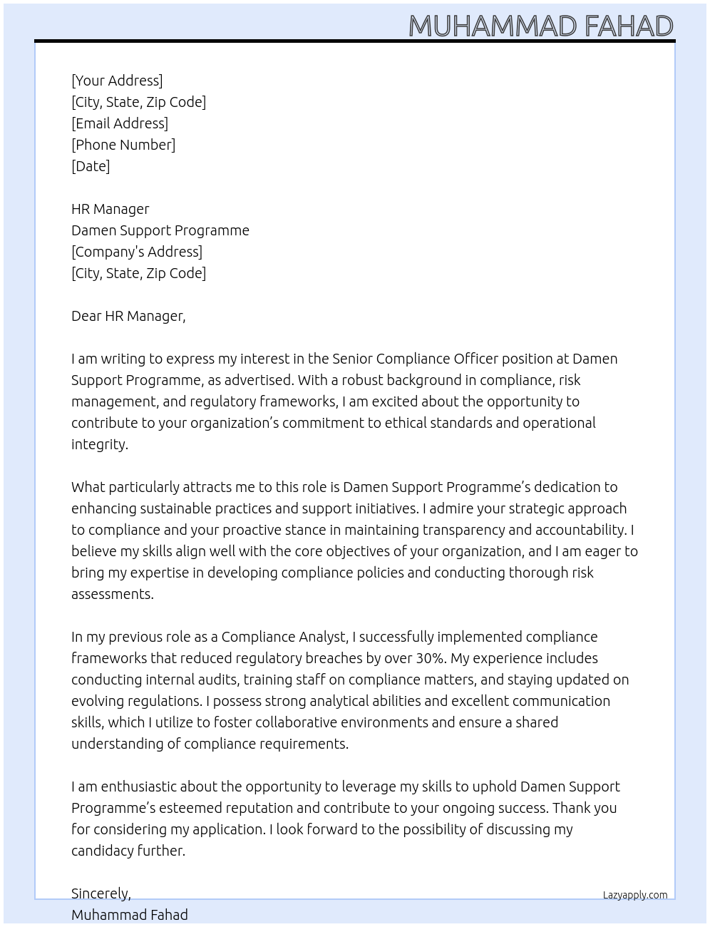 Senior Compliance Officer Cover Letter At Damen Support Programme