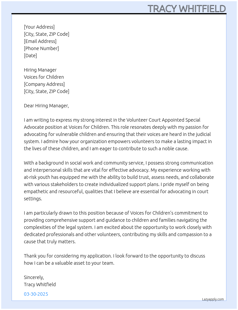 Check out these volunteer court appointed special advocate cover letter sample and examples previously used by job seekers to land on job interviews as volunteer court appointed special advocate. Use our AI cover letter generator to create a personalized cover letter as volunteer court appointed special advocate.