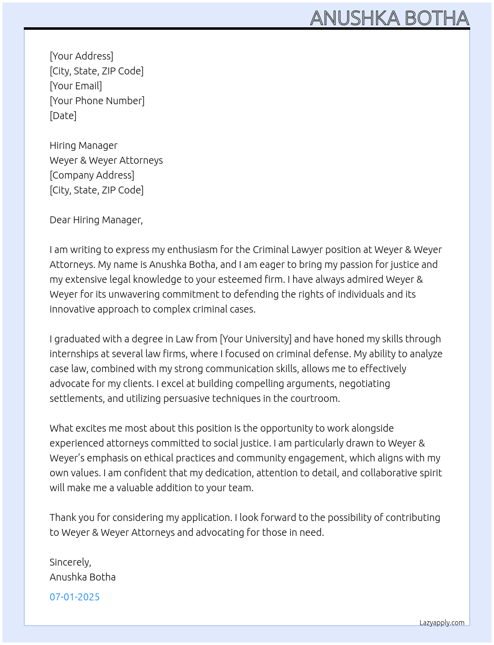 Criminal lawyer Cover Letter At Weyer & Weyer Attorneys
