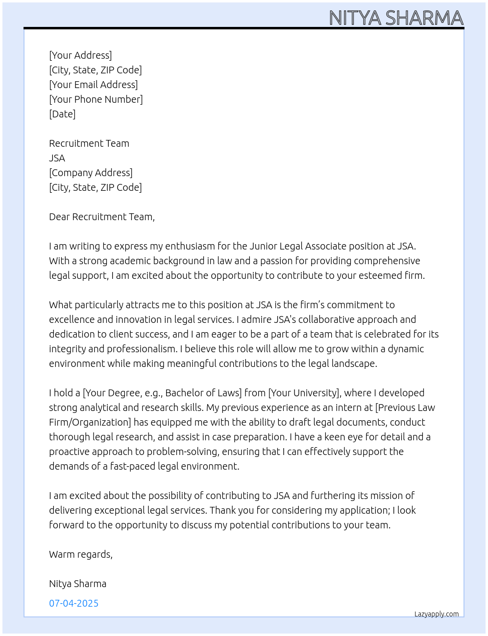 Check out these junior legal associate cover letter sample and examples previously used by job seekers to land on job interviews as junior legal associate. Use our AI cover letter generator to create a personalized cover letter as junior legal associate.