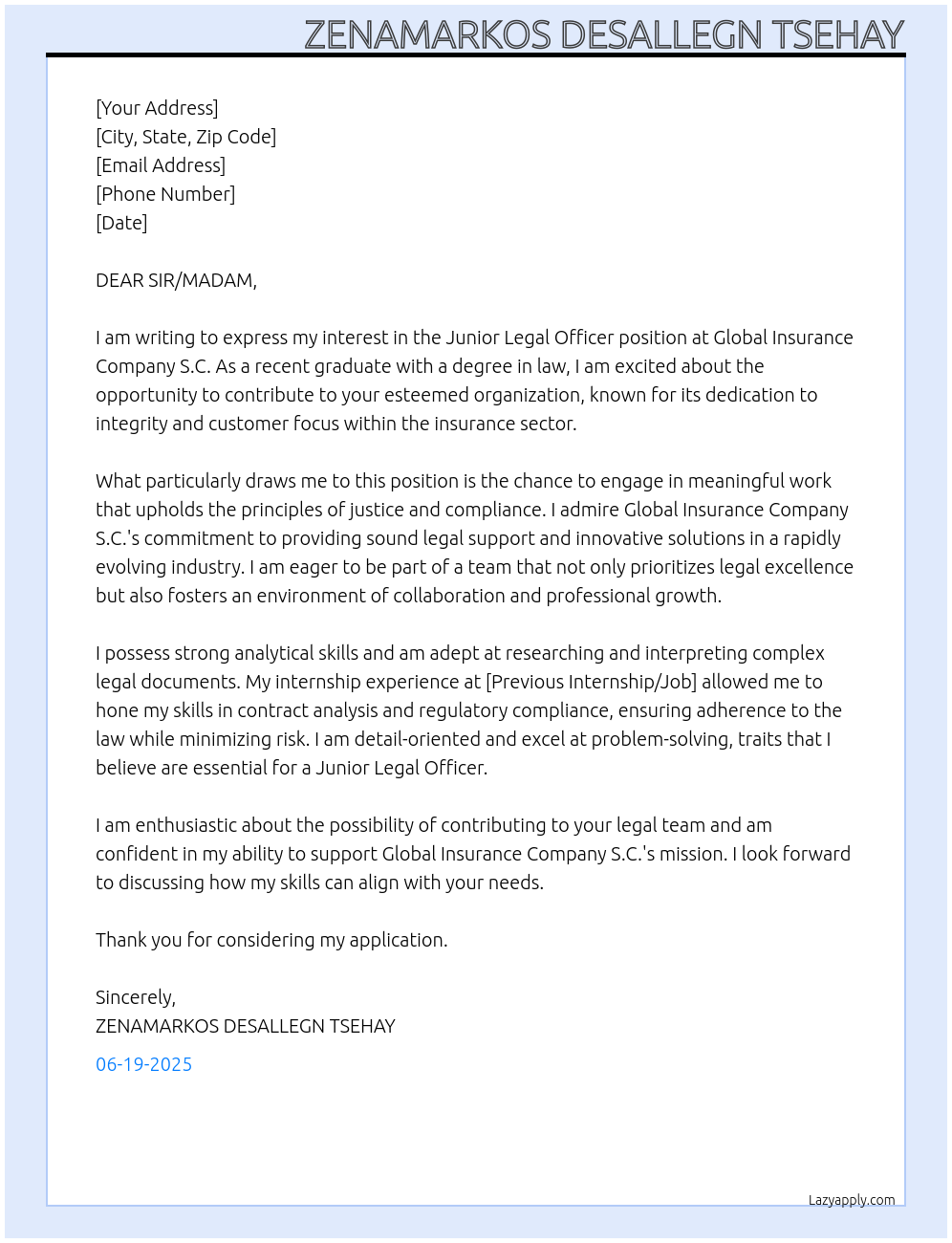 JUNIOR LEGAL OFFICER Cover Letter At GLOBAL INSURANCE COMPANY S.C