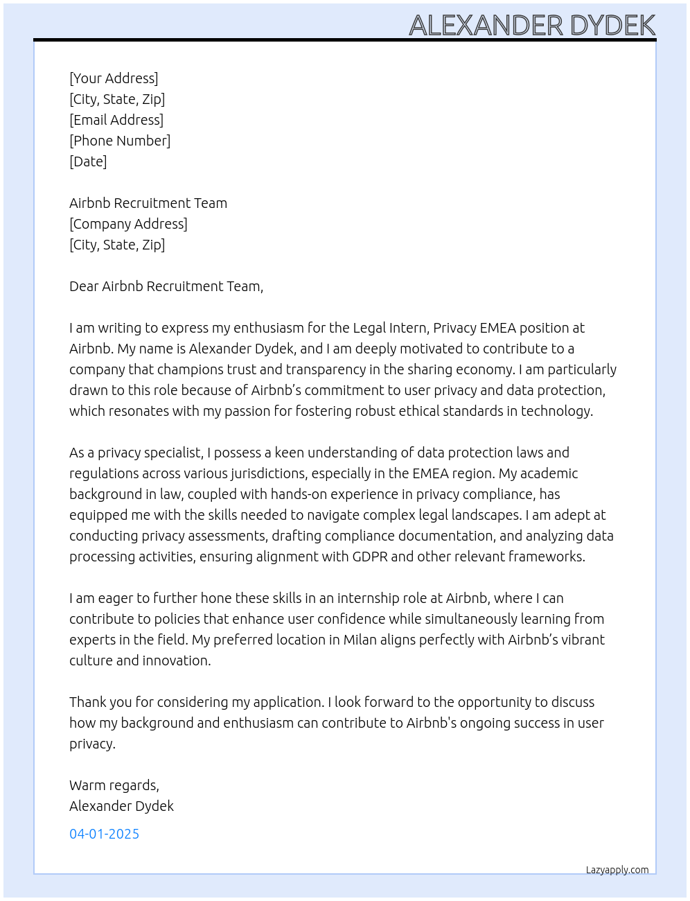 Check out these legal intern, privacy emea cover letter sample and examples previously used by job seekers to land on job interviews as legal intern, privacy emea. Use our AI cover letter generator to create a personalized cover letter as legal intern, privacy emea.