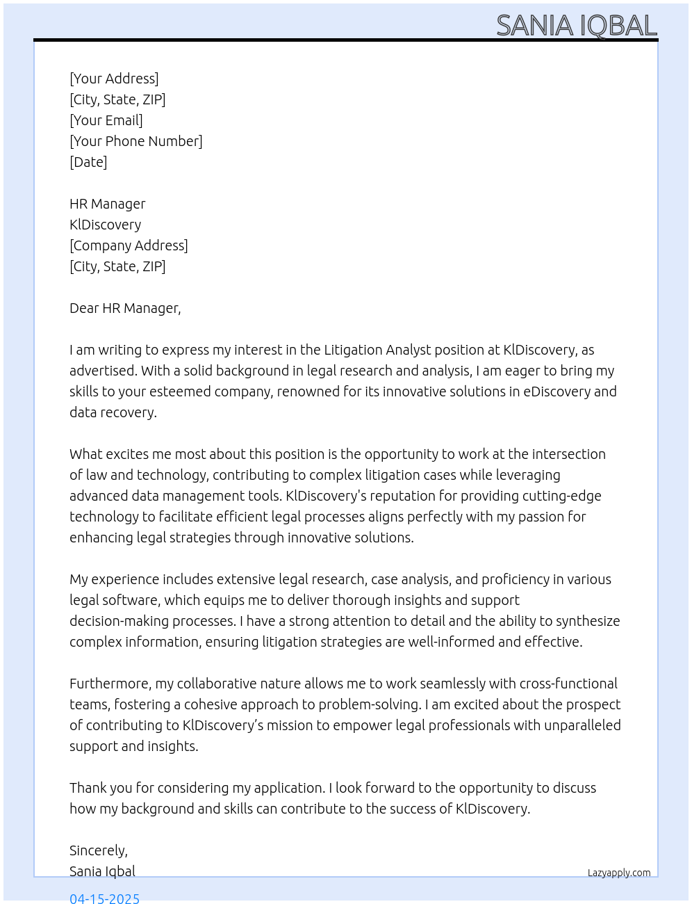 Check out these litigation analyst cover letter sample and examples previously used by job seekers to land on job interviews as litigation analyst. Use our AI cover letter generator to create a personalized cover letter as litigation analyst.