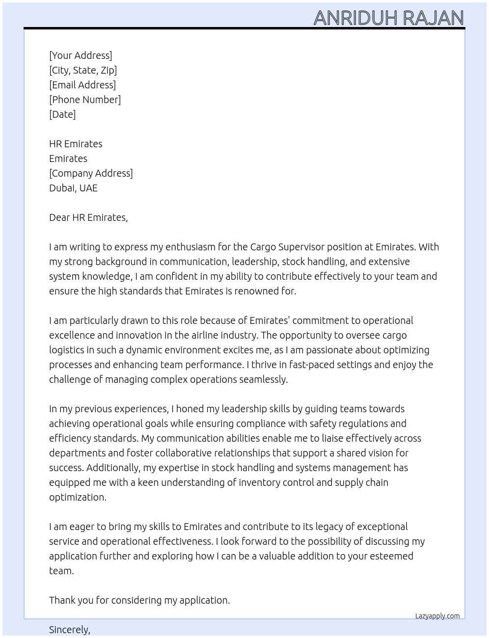 CARGO SUPERVISOR Cover Letter At EMIRATES