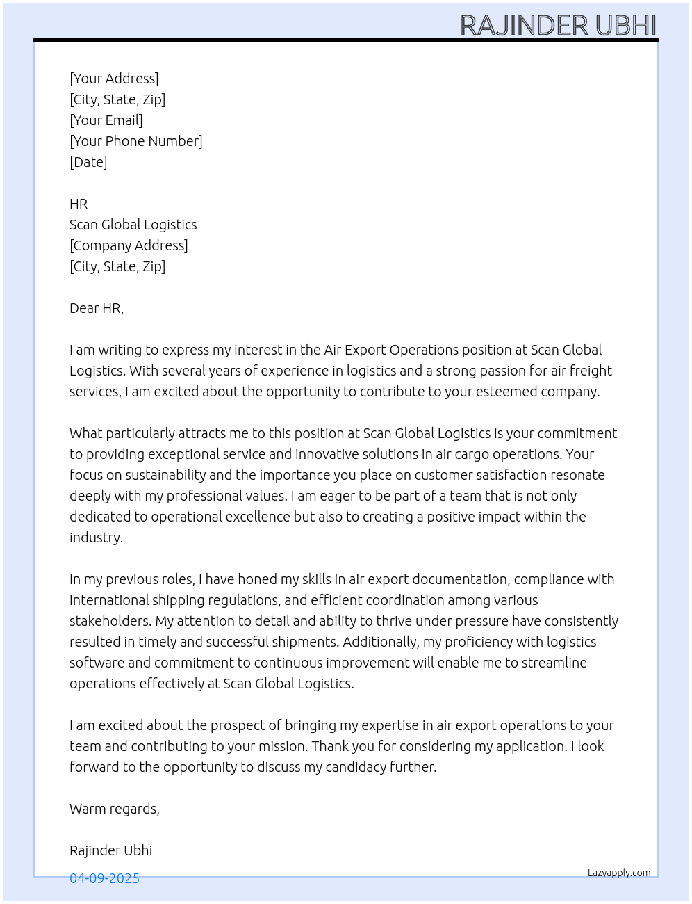 Cover letter for air export operations - LazyApply