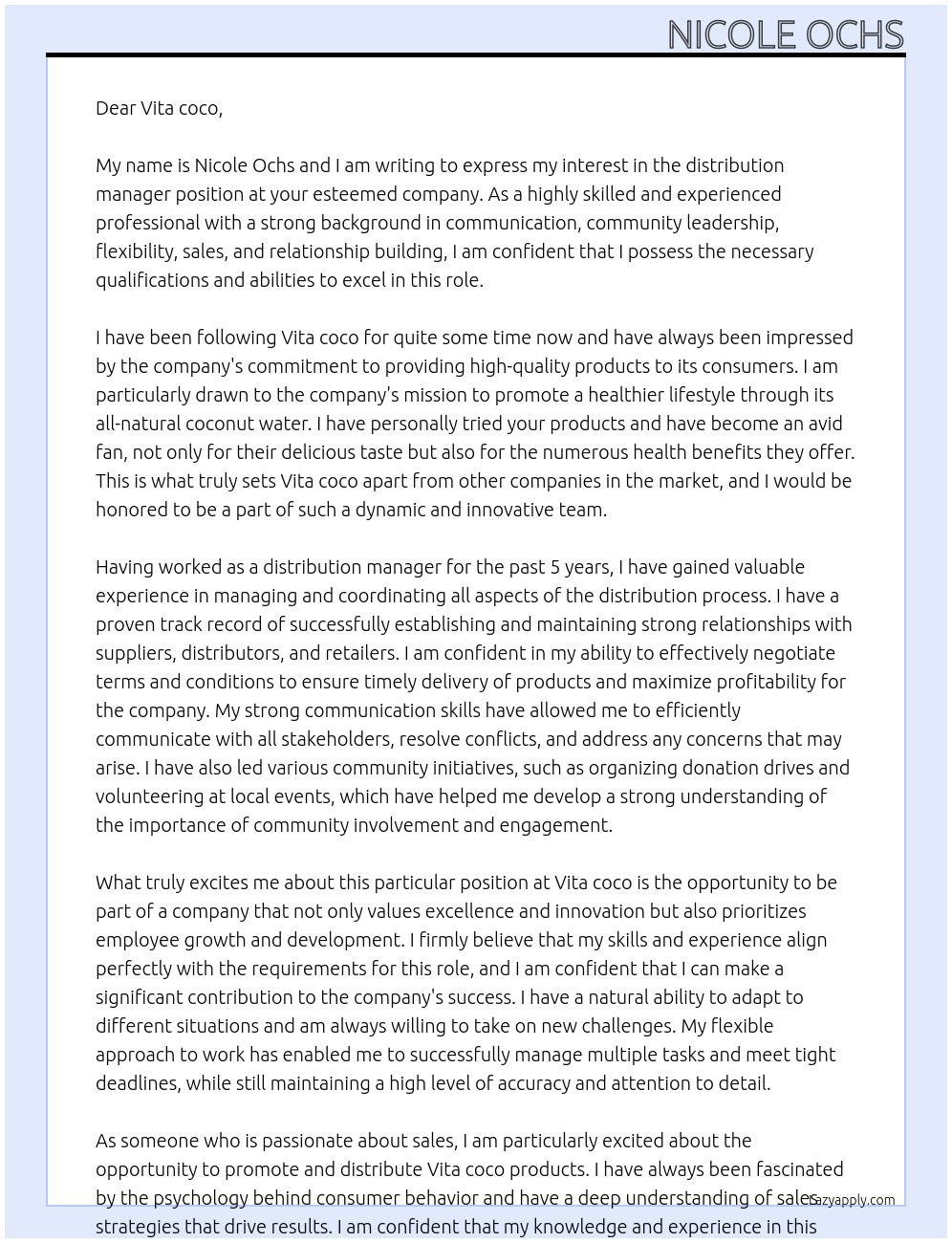 Distribution manager Cover Letter At Vita coco