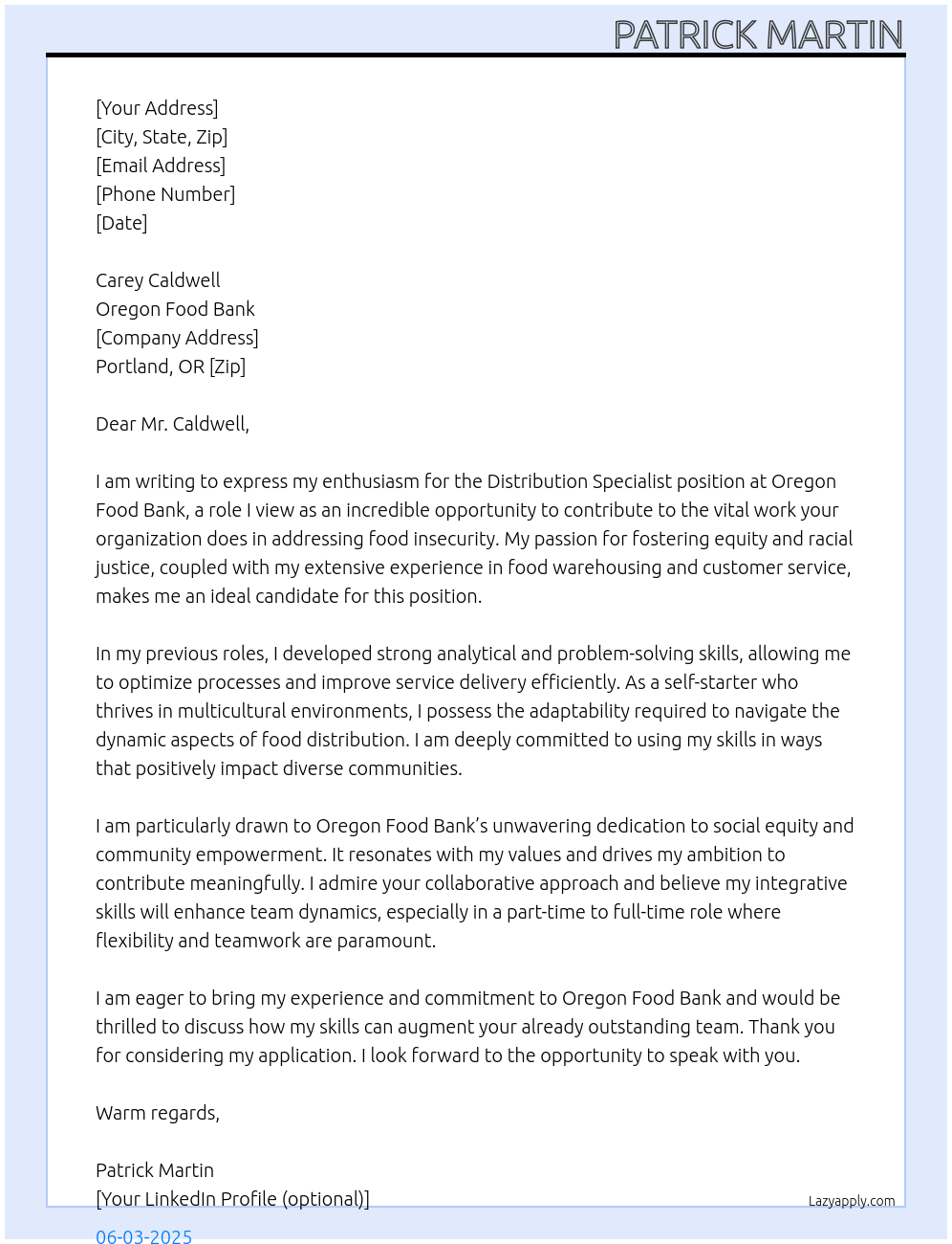 Distribution Specialist Cover Letter At Oregon Food Bank