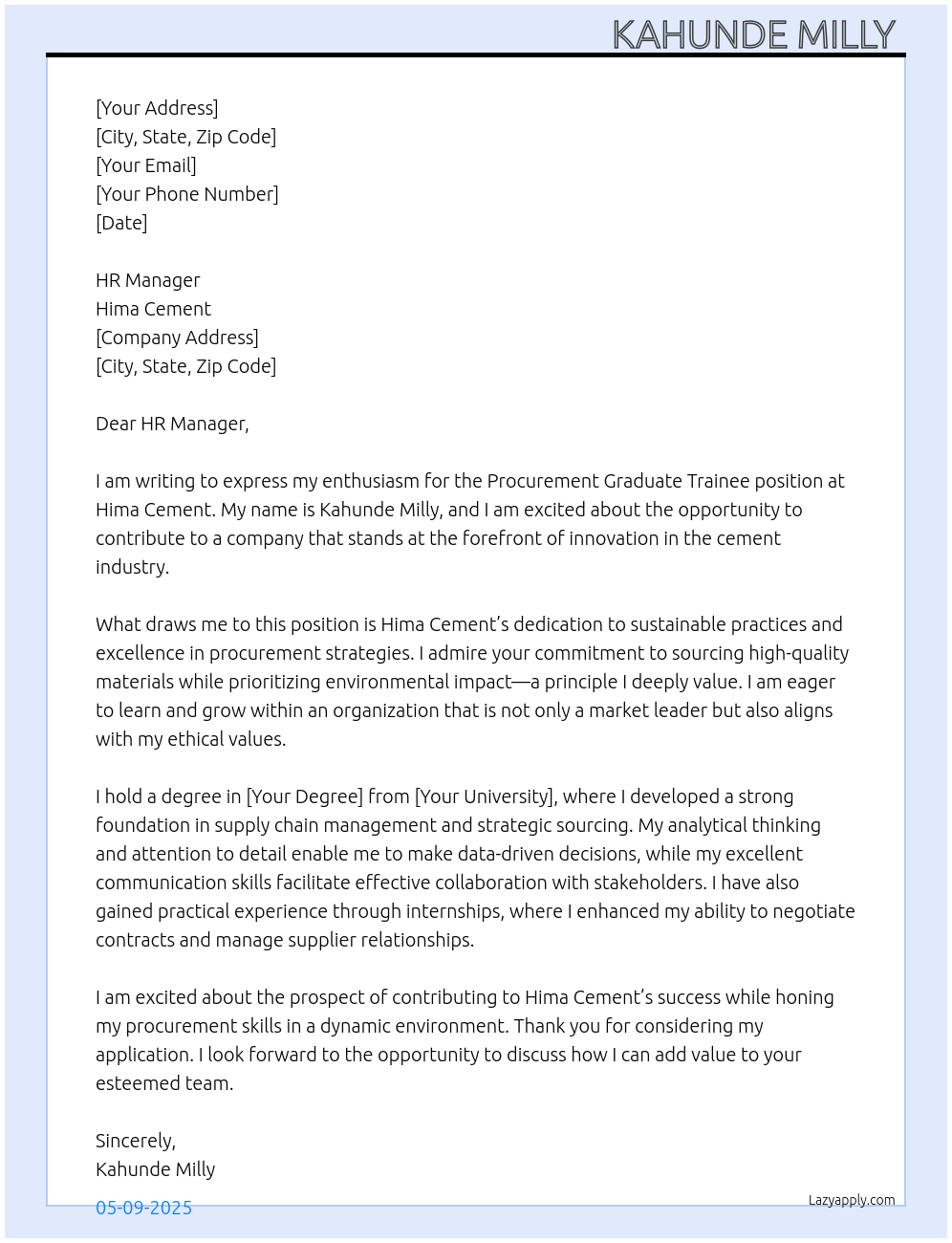 Procurement graduate trainee Cover Letter At Hima cement