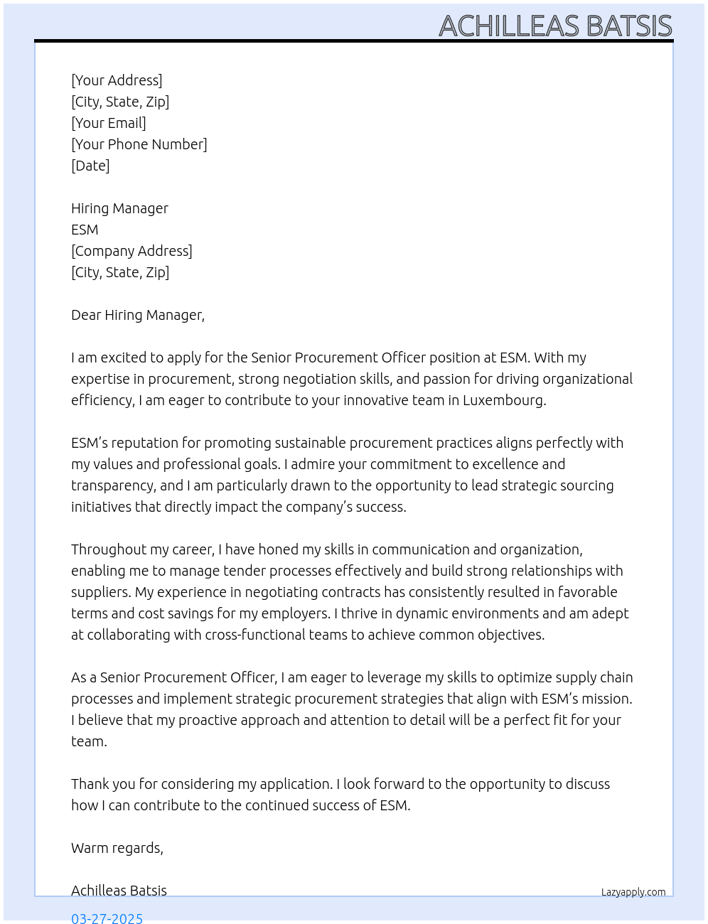 Check out these senior procurement officer cover letter sample and examples previously used by job seekers to land on job interviews as senior procurement officer. Use our AI cover letter generator to create a personalized cover letter as senior procurement officer.