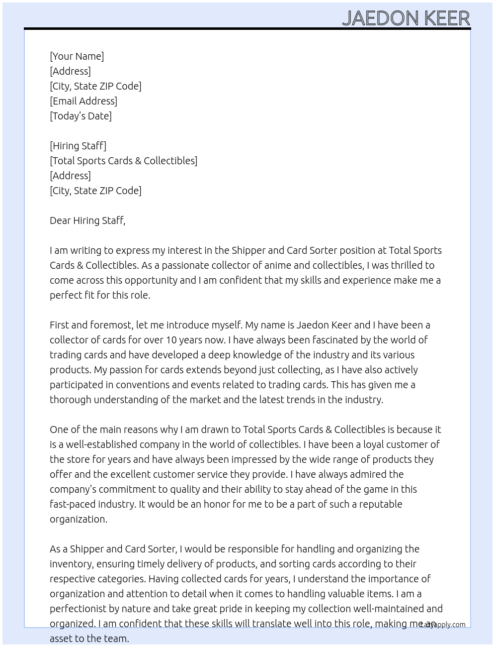 Cover letter for shipper and card sorter - LazyApply