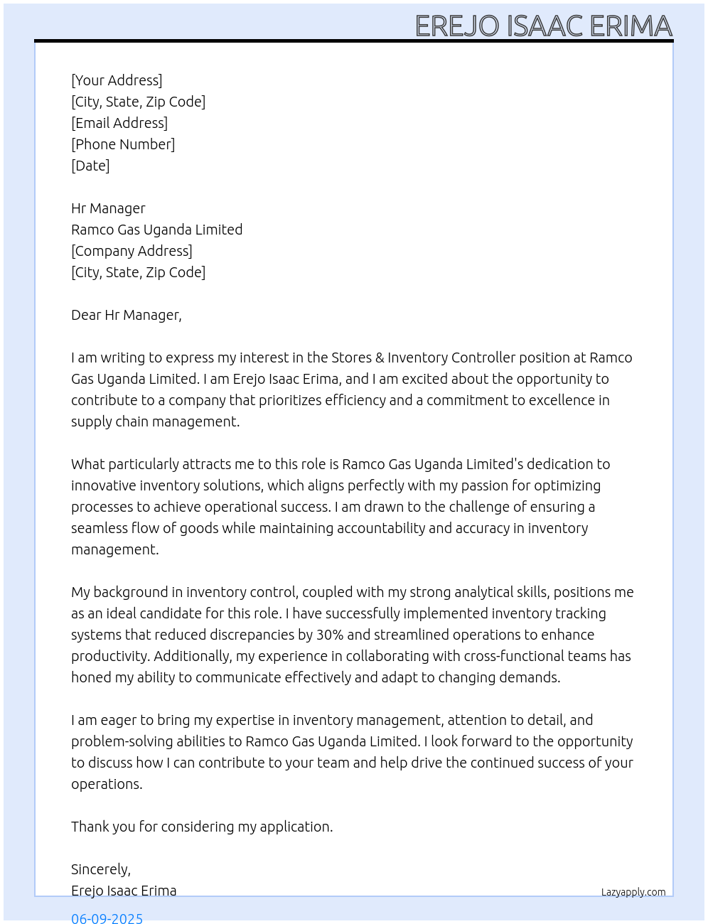 Stores &Inventory Controller Cover Letter At Ramco Gas Uganda Limited