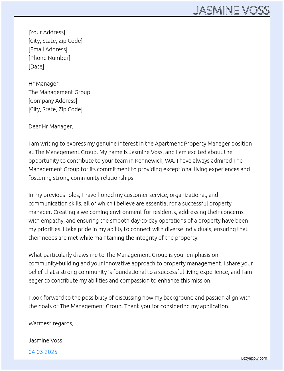 Check out these apartment property manager cover letter sample and examples previously used by job seekers to land on job interviews as apartment property manager. Use our AI cover letter generator to create a personalized cover letter as apartment property manager.