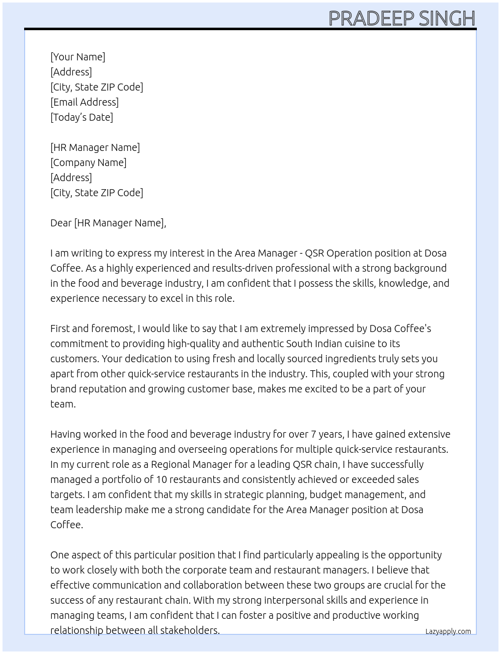 Area Manager - Qsr Operation Cover Letter Examples And Template