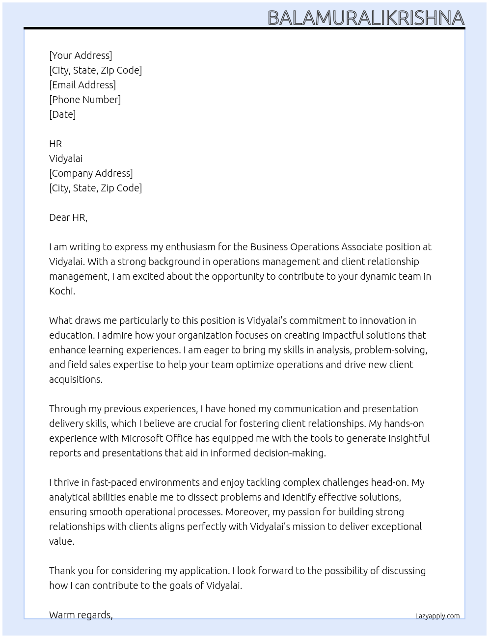 Check out these business operations associate cover letter sample and examples previously used by job seekers to land on job interviews as business operations associate. Use our AI cover letter generator to create a personalized cover letter as business operations associate.