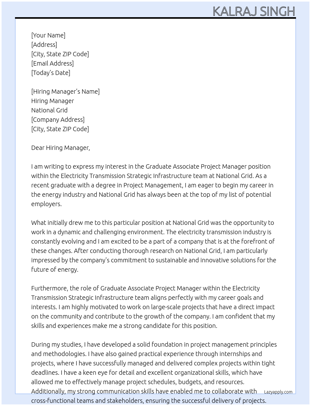 Graduate Associate Project Manager Position Within The Electricity Transmission Strategic Infrastructure Team At National Grid Cover Letter Examples And Template