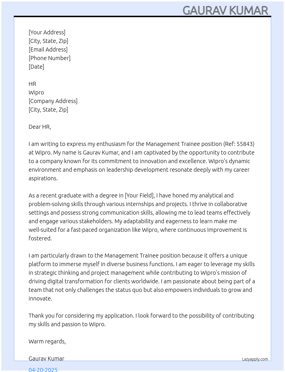 Check out these management trainee/55843 cover letter sample and examples previously used by job seekers to land on job interviews as management trainee/55843. Use our AI cover letter generator to create a personalized cover letter as management trainee/55843.