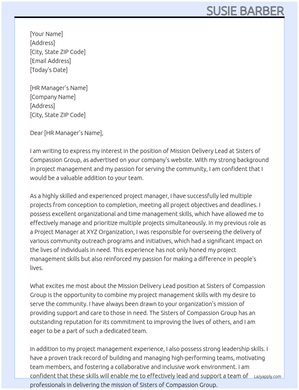 Mission Delivery Lead Cover Letter At Sisters of Compassion Group