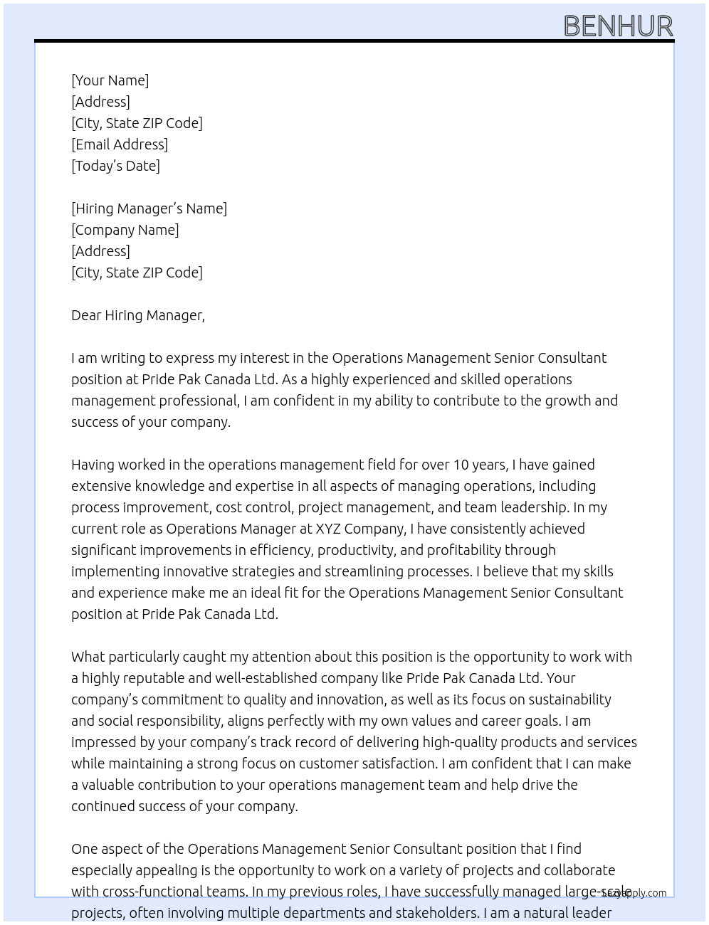operations management senior consultant Cover Letter At Pride Pak Canada Ltd