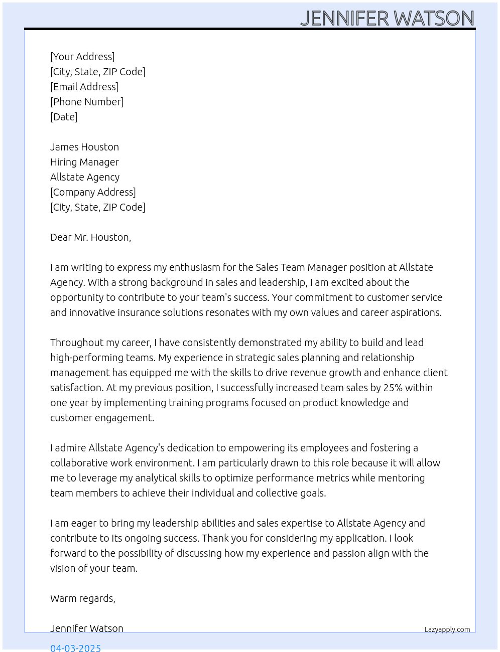 Check out these sales team manager cover letter sample and examples previously used by job seekers to land on job interviews as sales team manager. Use our AI cover letter generator to create a personalized cover letter as sales team manager.
