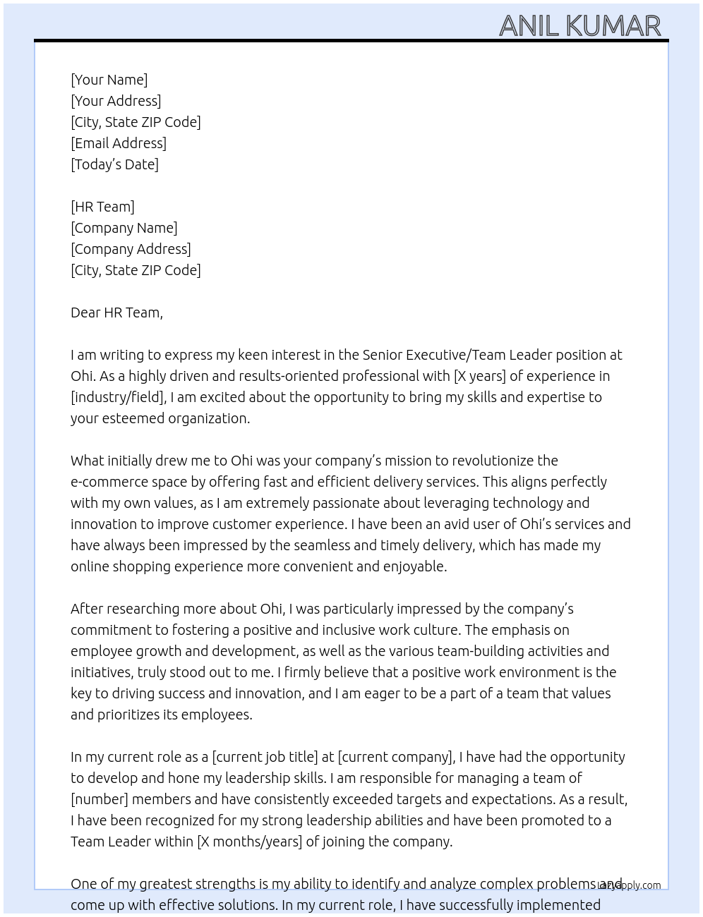 Check out these senior executive/team leader cover letter sample and examples previously used by job seekers to land on job interviews as senior executive/team leader. Use our AI cover letter generator to create a personalized cover letter as senior executive/team leader.
