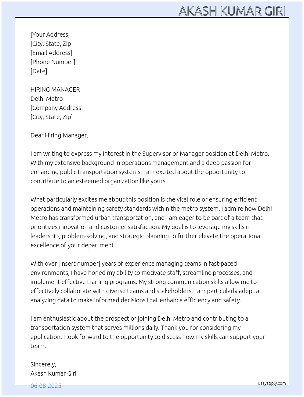 SUPERVISOR OR MANAGER DEPARTMENT Cover Letter At DILHI METRO
